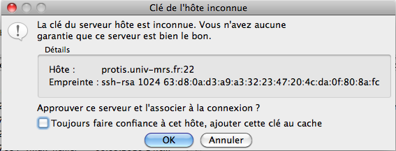 The authenticity of host 'protis.univ-mrs.fr (X.Y.Z.T)' can't be established. RSA key fingerprint is 63:d8:0a:d3:a9:a3:32:23:47:20:4c:da:0f:80:8a:fc. Are you sure you want to continue connecting (yes/no)?