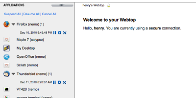 Après avoir saisi l'url SGD dans un navigateur dont le plugin java est disponible, on a accès à un certain nombre d'applis (celles que l'administrateur a choisi de publier) ou à un bureau Linux complet.